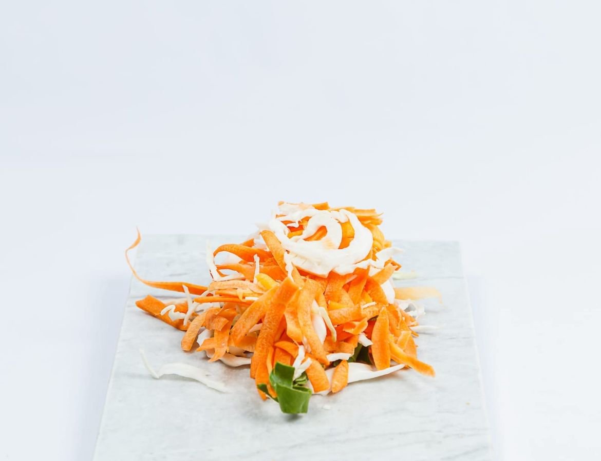 Componentes: Calabacín, zanahoria, repollo y apio. Corte rallado grueso.